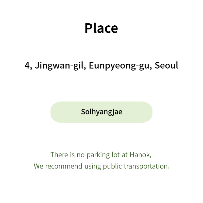 • 4 Jingwan-gil, Eunpyeong-gu, Seoul (Solhyangjae)(No parking lot)